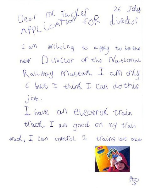 Letter Of Note of the Day: Upon learning that Andrew Scott, director of the National Railway Museum in York, was due to retire, 6-year-old Sam Pointon offered himself up as the perfect successor. “I have an electrick [sic] train track,” he wrote in his application.